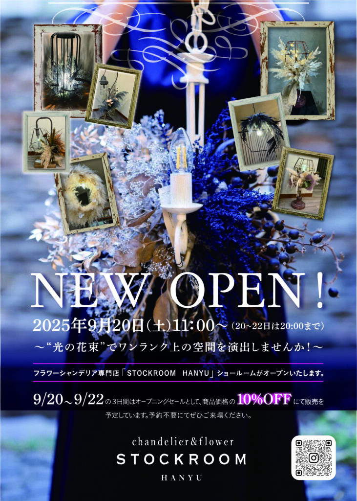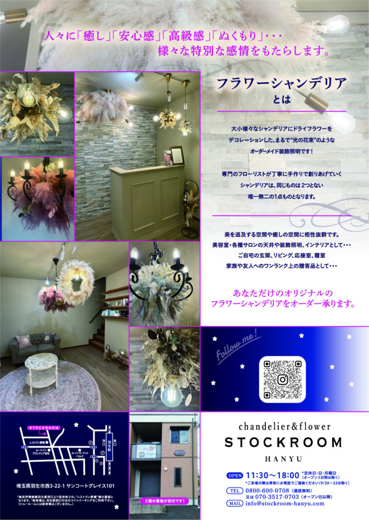 はじめまして。シャンデリア &ドライフラワー専門店 STOCKROOMの公式代理店として、この度、埼玉県羽生市にフラワーシャンデリア新規開店開店いたしました。