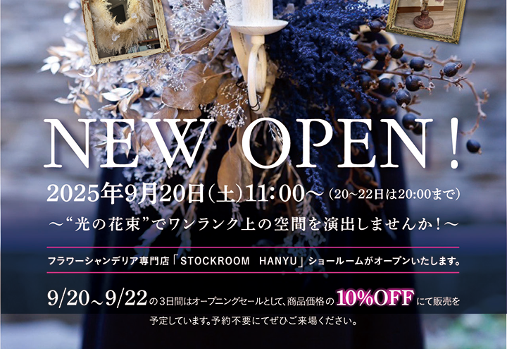 はじめまして。シャンデリア &ドライフラワー専門店 STOCKROOMの公式代理店として、この度、埼玉県羽生市にフラワーシャンデリア新規開店開店いたしました。